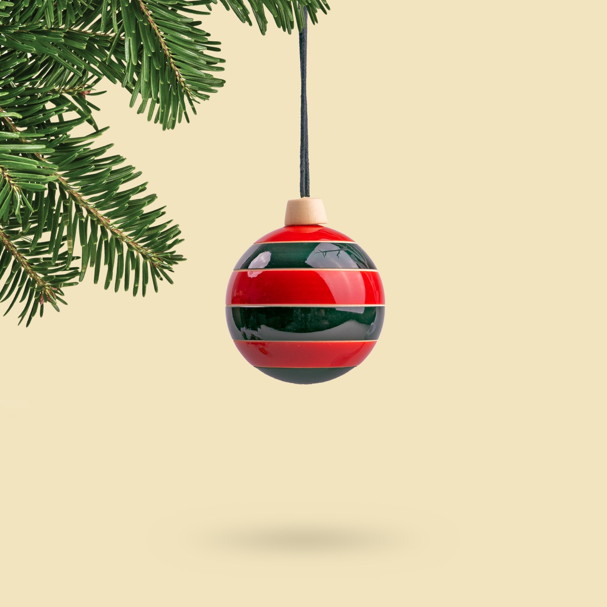 A classic sphere with bold festive stripes — cheerful, bright, and handcrafted to bring Christmas joy.
