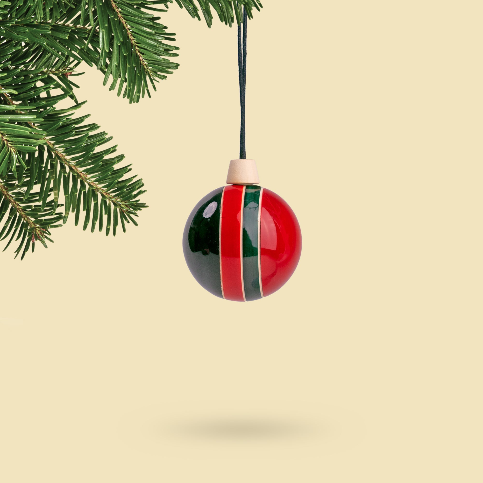 Sleek vertical stripes wrap this bauble like a gift — simple, striking, and full of festive charm.